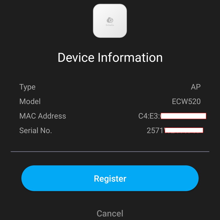 Select register device, the app will require camera permissions and you need to scan the included QR code at the bottom and automatically, the AP information will be displayed.