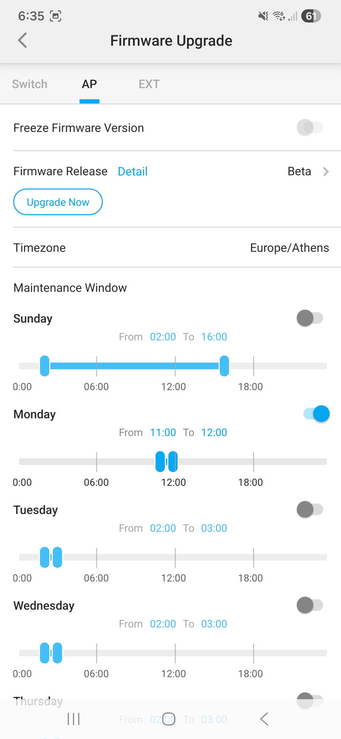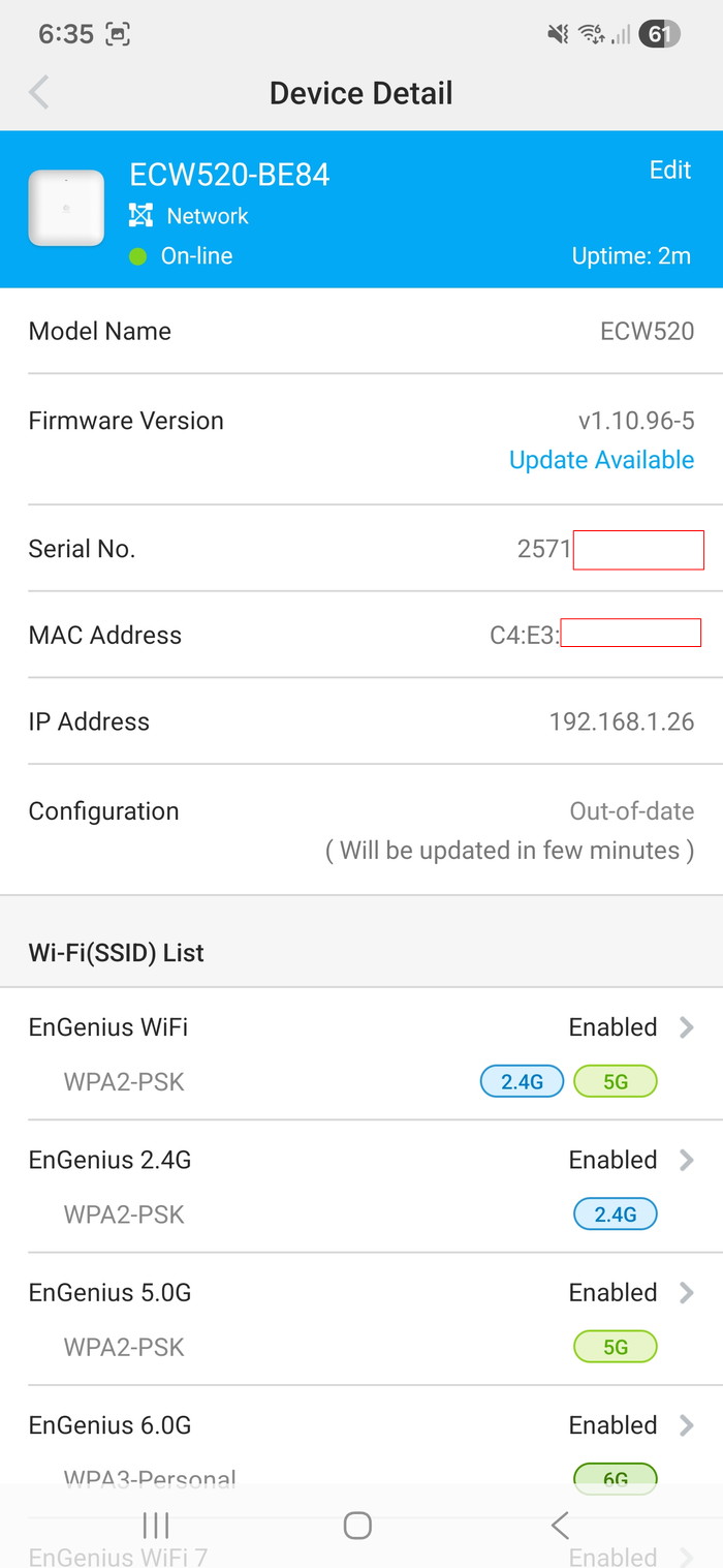 Selecting the ECW520 gives us many different options to choose from, the device has already a newer firmware update, which we apply before testing it. The Device detail displays all the needed information about the AP and you can fully control its functions.