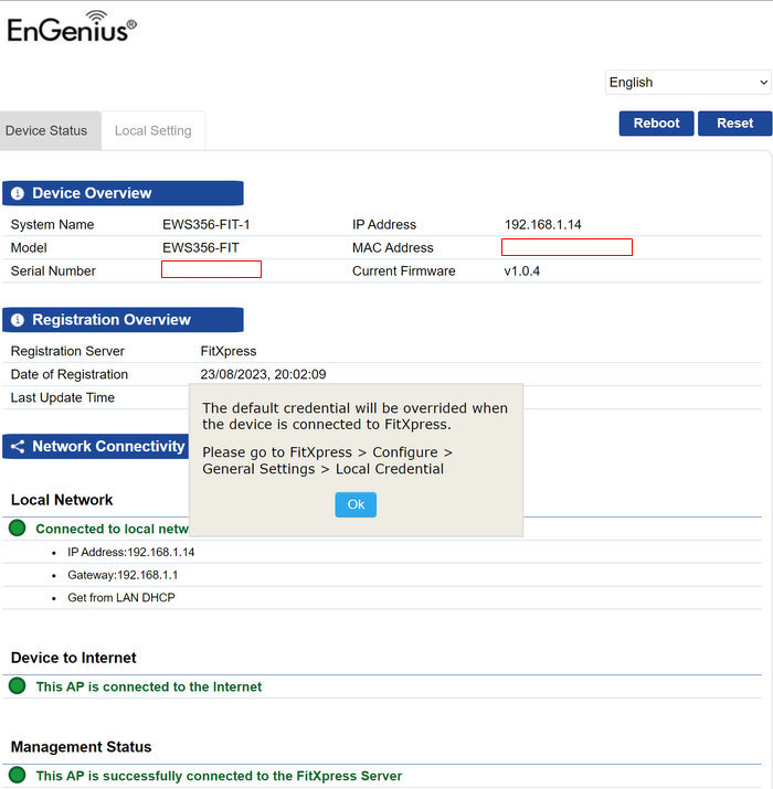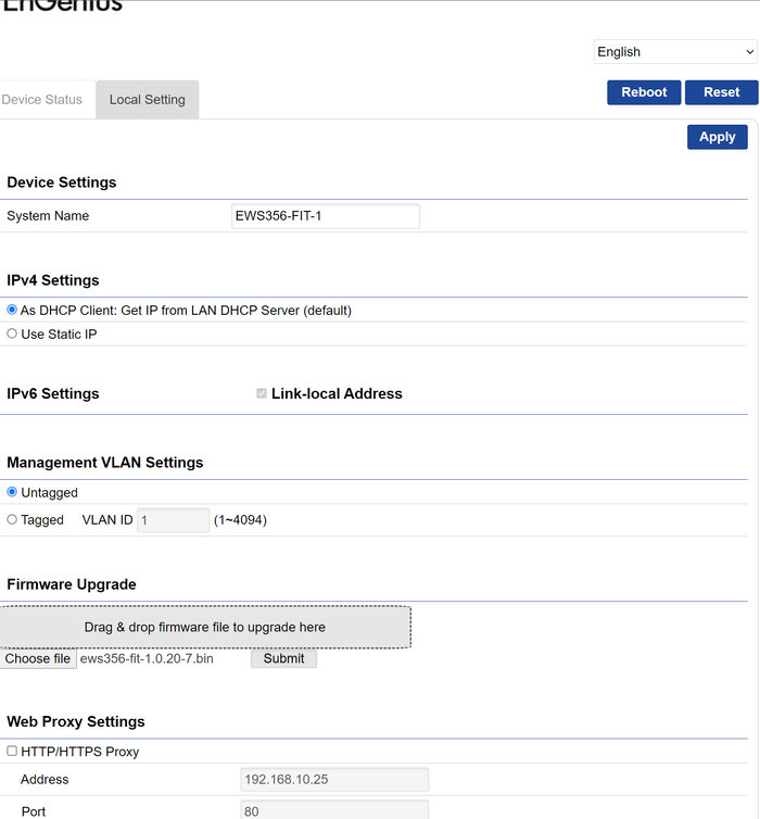 After looking at the EnGenius webiste, we found that there was a newer firmware revision of 1.0.20. However the firmware update process is not automated and users have to login to the local http control panel to start the firmware update process. You need to type https://xxx.xxx.xxx.xxx where xxx is the IP address of your EnGenius EWS356-FIT Access Point. The default username/password is admin/admin .