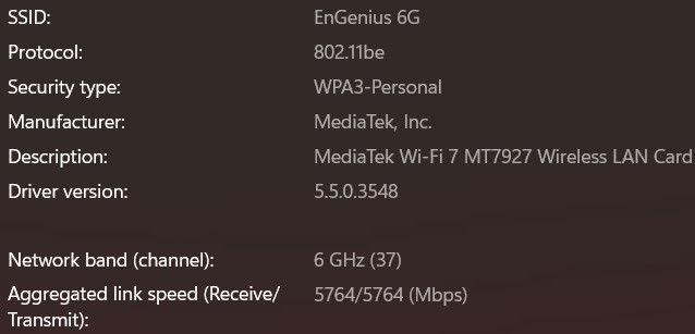 With the latest build of Windows 11 24H2, the Realtek Wi-Fi 7 card connected at 5764Mbps up/down: