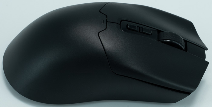 At the front users will find typical two buttons, one rotating knob, and two more buttons for DPI settings.