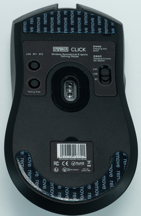 At the bottom of the mouse, users will find most controls and should remove protective stickers before use.