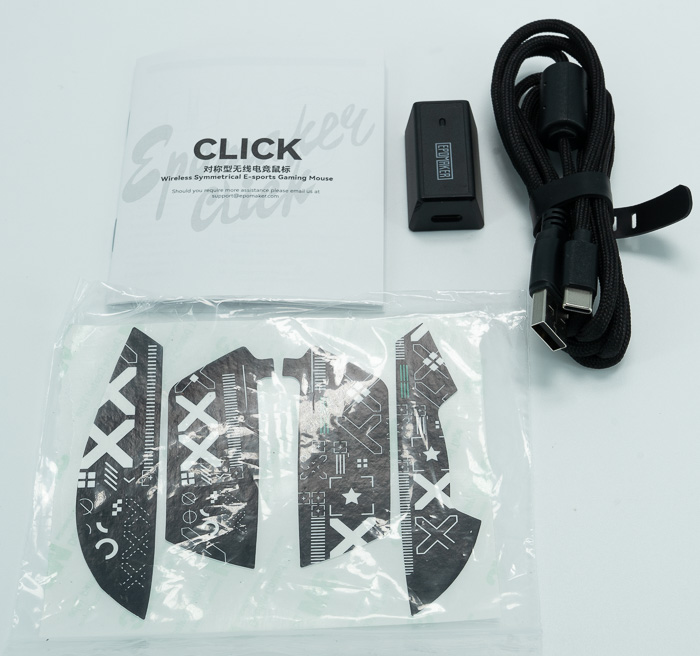 Inside the Box, users will find the Epomaker Click Mouse, a 2.4G Dongle, a long USB A to C Cable, and a printed User Manual.