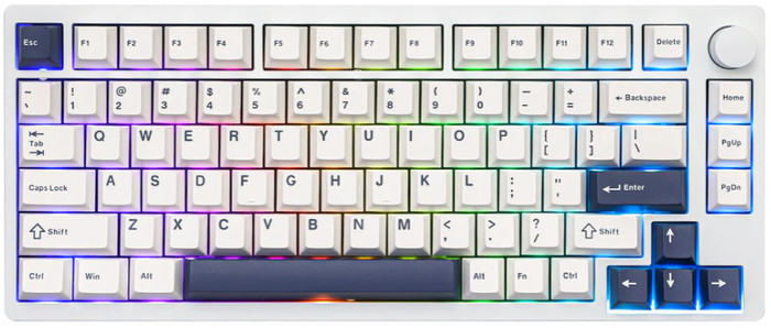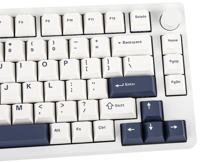 At the top right corner users will find a rotating knob/scroll wheel that can be used to control music levels (right rotation volume +, left rotation volume -, press -> mute). There are also 4 keys for up/down/left/right and Home/PgUp/PgDn keys. The Del key is next to the rotating knob, a rather unusual place to put it. With the EPOMAKER P75 keyboard, you won't find LED indicator lights, instead, the Caps Lock and Windows key both illuminate white when you press their respective locks.