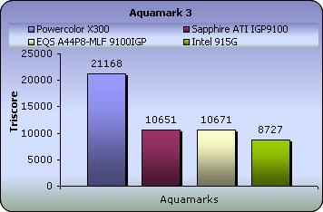 With Aquamark03, the EQS A44P8's integrated graphics processor took the lead from Sapphire ny a margin of just 20 points in the Triscore. It's now clear that ATi has shown some improvement with its embedded chipsets such as the IGP9100 and IXP300 used on this motherboard.