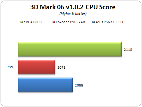 3D Mar06 tests both CPU and RAM as well as the VGA card. The EVGA 680i LT had the highest score with 2113 marks.