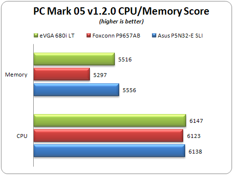 PCMark®05 is everything you need to reliably and easily measure the performance of your PC and determine its strengths and weaknesses. With PCMark05, you will be able to select the optimal upgrades for your existing PC, or choose the right new PC that fits your specific needs. This easy-to-use product gives you the same tools and knowledge that virtually every professional tester in the industry uses. Below you can see the scores for the 3 motherboards for both the memory and CPU benchmarks.