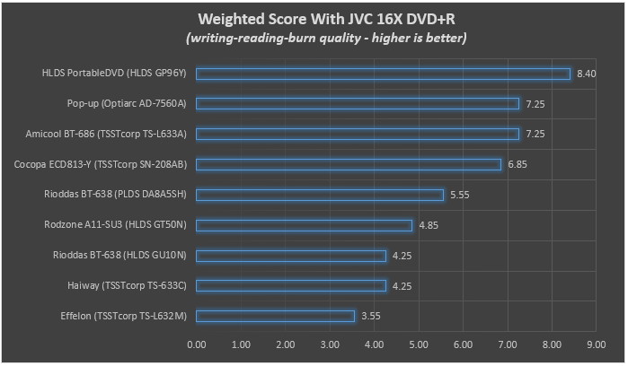With the JVC 16X DVD+R media, the HLDS PortableDVD (HLDS GP96Y) managed to produce the lowest error rates among all tested drives so it got the first place with 8.40 points!