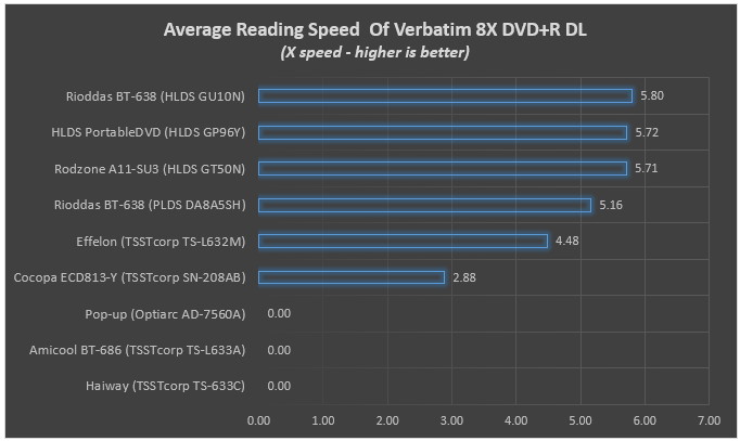 The three first drives managed to get around 4.96~4.99X writing speeds. The Cocopa ECD813-Y (TSSTcorp SN-208AB) had much lower writing speed... After the burn process, we tried to read the burned disc with the same drive and wrote down their average reading speed.