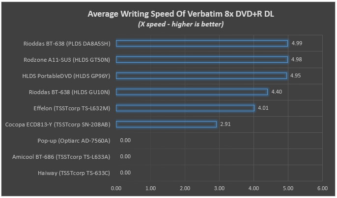 Not all tested drives recognized the Verbatim 8X DVD+R DL media. Three drives failed to recognized the empty disc and got a zero score at this test.