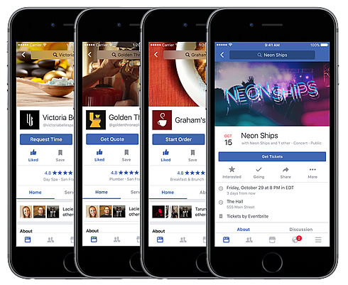 Facebook launched tools that allow users to order or reserve a range of servies through businesses’ Pages, such as order food from any restaurant that uses Delivery.com or Slice; request appointments from businesses that use HomeAdvsior, MyTime and some other services; order movie tickets through a Fandango integration; or buy tickets for events through a partnership with Ticketmaster and Eventbrite. Without any integrations, businesses can also add a "Get Quote" button or appointment booking button, which will automatically generate a Messenger thread between the business and user. The buttons are available to all businesses in the U.S., and more third-party services will be added in the coming months, Facebook said.