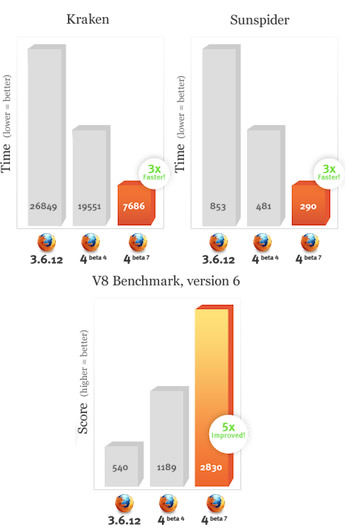 Here?s how the latest beta compares with Firefox 3.6 and previous versions of Firefox 4 Beta on various JavaScript benchmark test suites:
