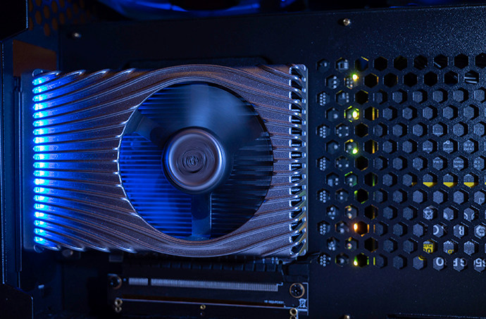 Below you see Intel’s Xe DG1 Software Development Vehicle that it is sampling to ISV partners now. The pictures show a grapics casrd with a short PCB and a dual-slot cooler. Of course, the graphics card you see pictured here is not likely representative of what will hit store shelves sometime later this year. It’s a device Intel is seeding to developers so they can optimize their software, applications, and games to leverage the Xe graphics architecture.