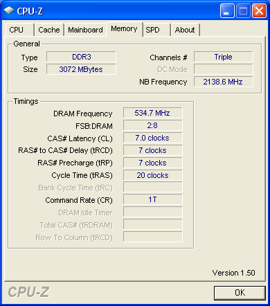 - Memory: 3x1GB Crucial PC3-1066 (CL7-7-7-20-1T@1.65V)