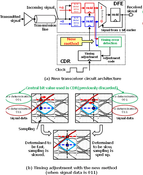 With this newly developed timing detection method, the two companies were able to eliminate the previously required CDR incoming-signal timing-determination circuit, and lines, such as the clock line, which were required as the DFE and CDR operated with different timing. This made it possible for them to succeed in developing transceiver circuitry that doubles speeds to 56 Gbps with the same power consumption as before.