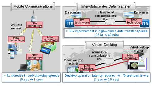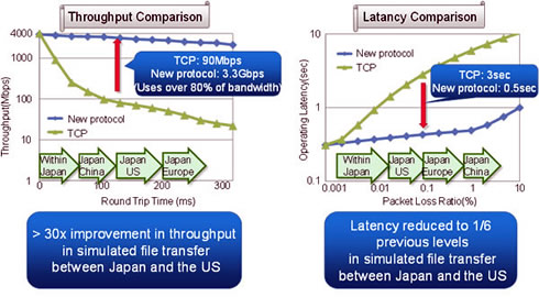 Moreover, compared with TCP, the new technology enables a 30 times improvement in file transfer speeds between Japan and the US, in addition to reducing virtual desktop operating latency to less than 1/6 of previous levels. This, in turn, is expected to make it easier to take advantage of various applications employing international communication lines and wireless networks which are anticipated to become increasingly widespread.