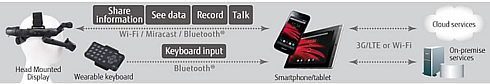 Combining an HMD with middleware such as FUJITSU Software Interstage AR Processing Server, an augmented-reality platform product, and operational-support services such as FUJITSU Business Application AZCLOUD SaaS teraSpection allows for task support using still pictures, video, and audio. The operator wears the Head Mounted Display and views the display for information pertaining to the tasks being performed, such as inspection check lists or work procedures, while using both hands for the task. This dramatically improves operational efficiency and avoids problems of overlooking steps or doing them out of order. The unit can be used with the attached wearable keyboard or the audio command function to carry out a variety of operations, including turning pages in a work manual, entering numbers or taking images with a camera.