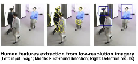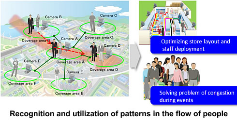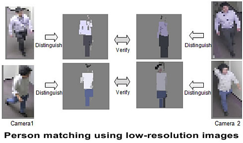 Fujitsu has developed a technology that provides highly accurate detection of people's movements and that can recognize the flow of people from low-resolution imagery incapable of distinguishing faces. In existing systems that analyze video taken from surveillance cameras, the video resolution should be high enough in order the system to identify individuals. Typically, in order to extract information on flows of people appearing in a video, current approached extract a person-like shape from an image and by using multiple cameras, it is determine whether a person detected by one camera is the same person detected by other cameras. Because these teqniques have used information detected from a person's face, build, gender, and other personal characteristics to determine if it is the same person, the problem has been that the person may be identified, causing the video to be unusable due to privacy issues.