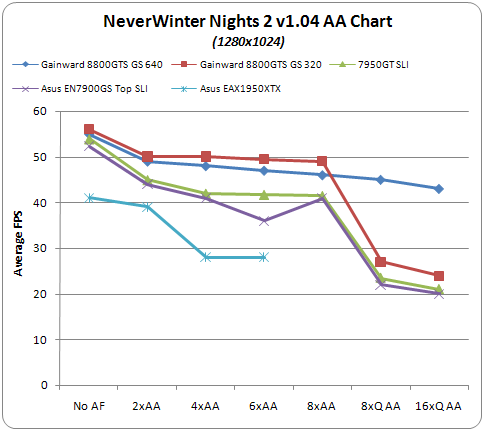 NeverWinter Nights2 is a "difficult" game with all visual enhancements enabled. The Gainward 8800GTS GS 320MB showed superb performance with 56FPS average refresh rate.
