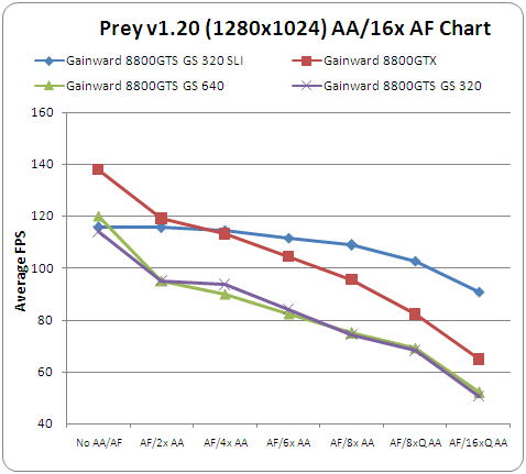 Enabling the various AA/AF rendering modes, we see that after 4x AA, the 8800GTS 320 SLI outperformed the 8800GTX and suffers far less as the effects are piled on.