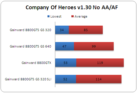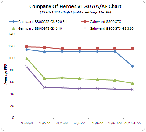 We used the built-in benchmark for all tests at 1280x1024 resolution. Since AA/AF cannot be set from within game, we used Nvidia's 3D control panel for each mode. The built-in Antialiasing setting for Company Of Heroes has been disabled. Let's see how the card performed in the Company Of Heroes Benchmark with High Quality settings.