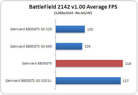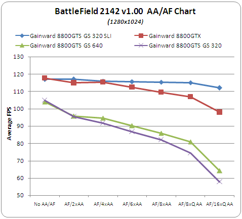 Enabling AA/AF in Battlefield 2142 enhances visual quality and of course gaming experience. As we can see, the Gainward 8800GTX is neck and neck with the 8800GTS 320SLI setup until 6x AA, where its performance slowly drops off.