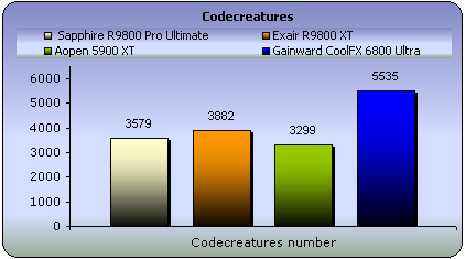 Code Creatures is a synthetic 3D benchmark that is a good reference for VGA performance comparison. This is a high-end 3D benchmark that also requires DirectX 8 copliant hardware, making it a good tool for measuring the potential of DirectX 8 game performance.