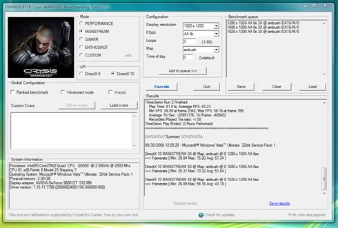 We used the hocbench Crysis benchmark tool at the resolutions of 1280x1024, 1680x1050 and finally 1920x1200. We run the benchmark software with "High" and "Very High" details enabled in order to identify the optimum settings for a decent game play.