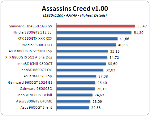 Assassins Creed is a new game from Ubisoft that supports the DirectX 10.1 extensions. Its graphics are highly demanding, especially when all details are maxed out. We tested the graphics cards only at the resolution of 1920x1200, since lower resolutions for the specific game are not very demanding. Using FRAPS we recorded the same fight scene and the game results presented below.