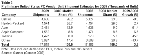 "These are good results especially given that PC shipments for the third quarter of 2009 are being compared to a very strong third quarter from 2008," said Mikako Kitagawa, principal analyst at Gartner. "Sequentially, third quarter shipments grew 18 percent, which is higher than the historical seasonal growth from the second to third quarter."