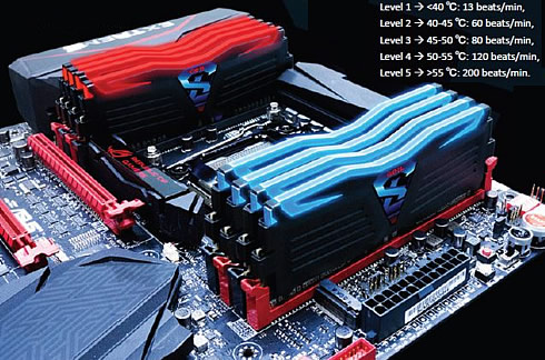 Connected directly on the memory's heat-spreaders, LEDs allow entusiasts observe the real-time temperature condition of the modules. As the working temperature of the memory rises, the tempo of the breathing-light goes up in five different levels: Level 1 is the mildest tempo and the lowest temperature range below 40 degrees C, while Level 5 represents the most rapid and the highest temperature range above 55 degrees C.