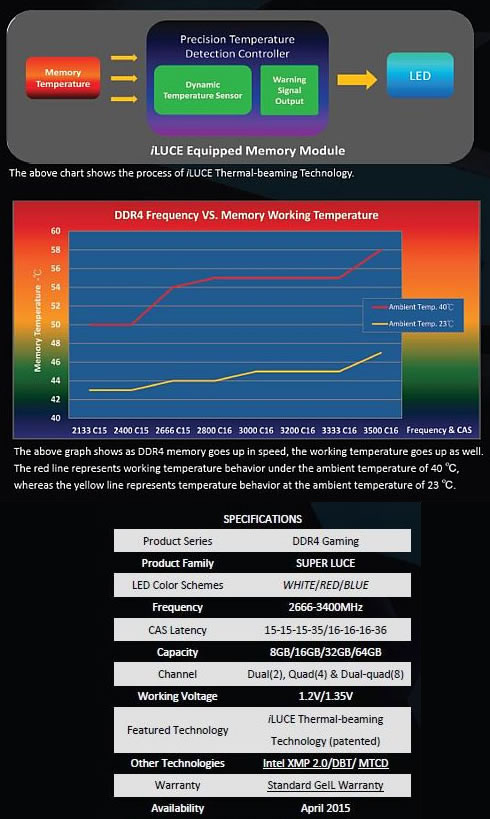Geil has unveiled the Super Luce, its latest benchmarking DDR4 gaming memory equipped with LEDs that show the real-time temperature condition of memory modules through different LED breathing-light tempos.