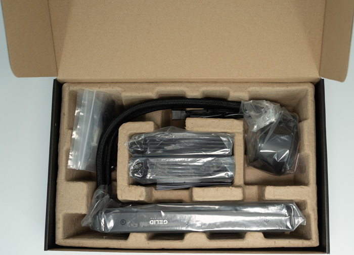 There are two FEP-sleeved tubes pre-installed for the radiator. Note that there isn't any hole to fill up the radiator. The product has a rather big pump with a copper base and two FEP-sleeved tubes that can be rotated for easier installation in your case.