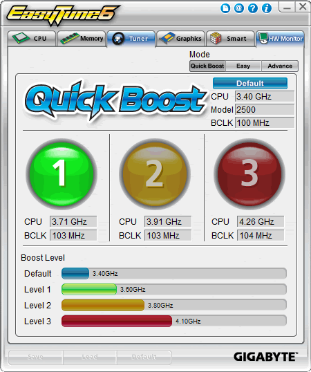 Through the Tuner tab you are able to take advantage of the Quick Boost mode and automatically overclock your computer. In our case, our Intel Core i5 2500K CPU (3.4GHz) can be set to run at 3.71GHz, 3.91GHz and 4.26GHz, by simply pushing the three available buttons. That's not the best t approach in our opinion since it would boost the BCLK only and our unlocked processor has higher potentials to overclock: