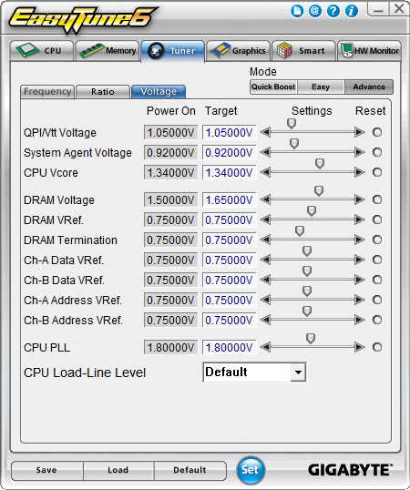 System voltages can be adjusted in the Advanced Voltage Settings subsection. The CPU voltage can be either fixed at a specific level or be increased by adding a certain value to it. The voltages can be also lowered compared to the default level.