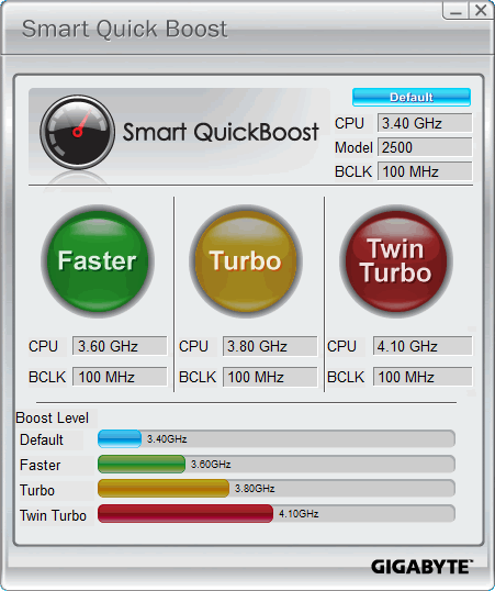 SMART QuickBoost is a tool that allows for quick CPU overclocking. Featuring three different levels of CPU performance including Faster, Turbo and Twin Turbo, Smart QuickBoost takes the guesswork out of overclocking with the simple click of a button: