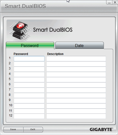 GIGABYTE's Smart DualBIOS allows up to 12 passwords to be stored for safe keeping, along with a short description. This makes it much easier to manage all your passwords. Smart DualBIOS is also password protected for security, so you still need to remember one password, but this is much easier than having to remember all 12.
