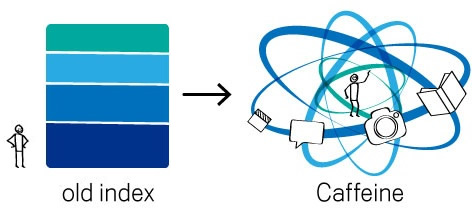 The image below illustrates how Gogole's old indexing system worked compared to Caffeine: