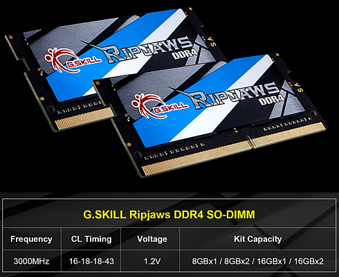 G.SKILL is releasing a new high-frequency, high-capacity addition to the Ripjaws SO-DIMM family: the DDR4-3000MHz CL16 kits at 1.2V, coming in 8GB to 32GB (16GBx2) configurations.