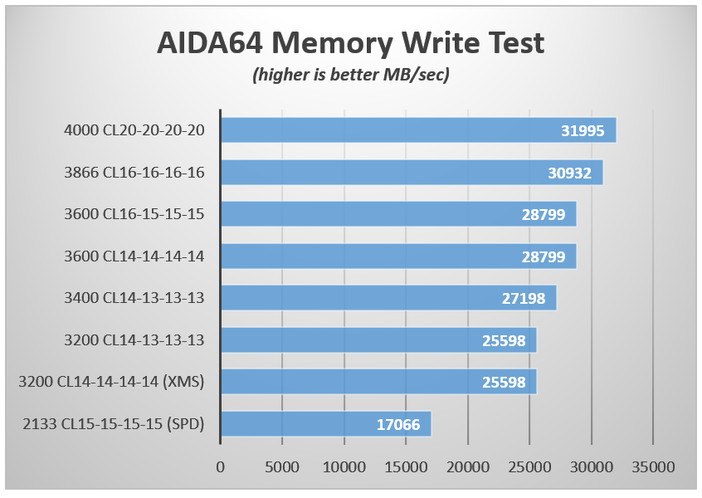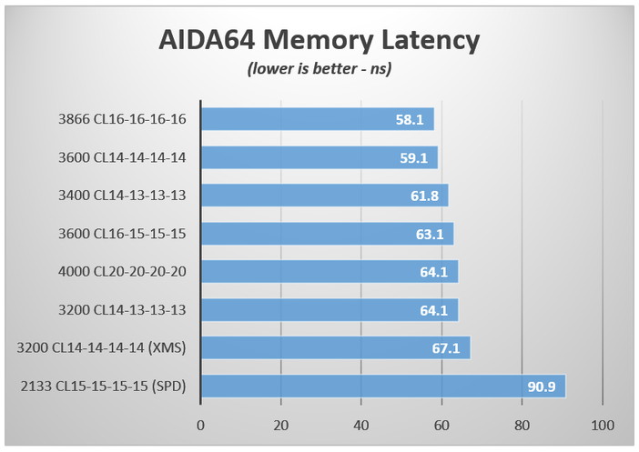 The AIDA64 gave us reading/writing/copy/latency results for all the memory speeds/timings we tried.