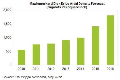 Maximum areal densities in hard disk drives (HDD) are expected to more than double during the five-year period from 2011 to 2016, spurring continued growth for HDDs in storage-intensive applications, according to a report by market research firm IHS iSuppli.