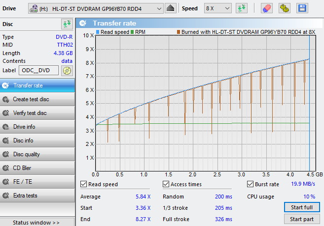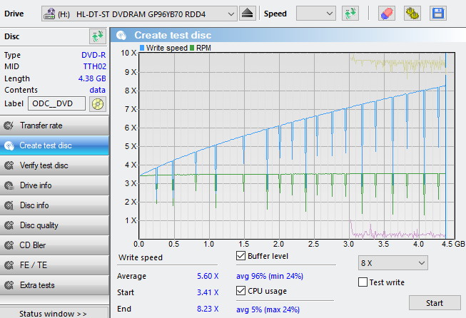 The drive started at 3.41X and ended at 8.23X resulting an 5.60X average writing speed.