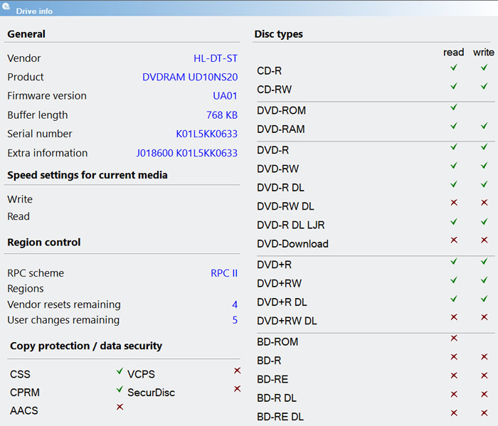 Using the latest OptiDriveControl v1.80 software we checked the drives abilities. The drive supports up to 24X CD-R, 8X DVD+/-R write, 6X DVD+/-R DL and 5X DVD-RAM writing speeds. The software indicates that the drive doesn't supports DVD+/-RW DL media, which is false, the drive can read and write them perfectly... The CD-DVD drive used with the UD Station drive is actually a GP96Y that we have already tested in depth.