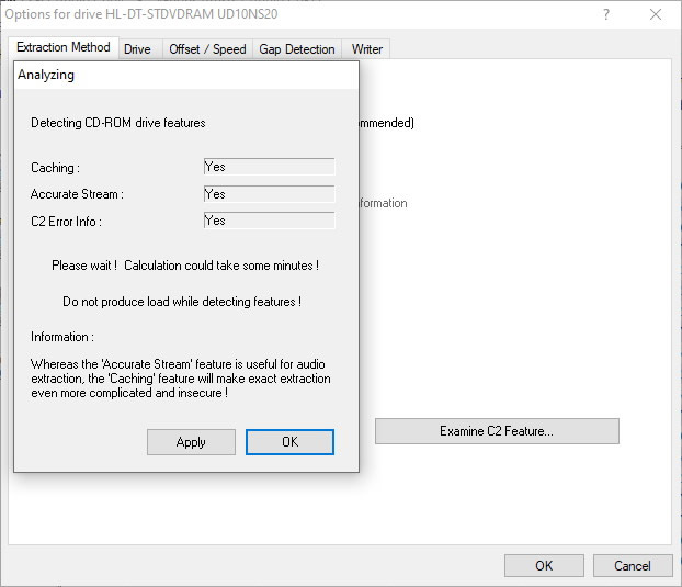 Using ExactAudioCopy we can see that the drive does caching and can produce Accurate Stream and report back C2 errors for accurate Audio CD ripping: