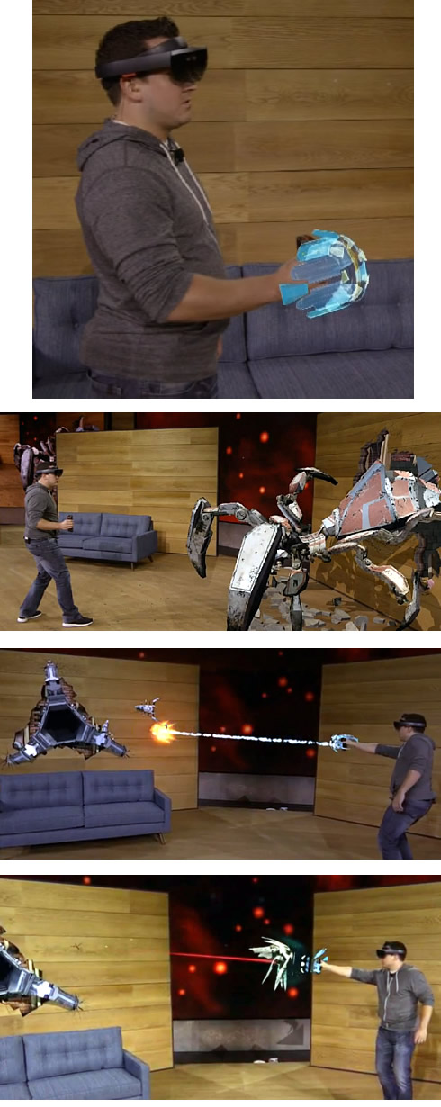 Microsoft also showed off its "mixed reality" games project in a HoloLens demonstration that uses holographic weapons. During th epresentation, spidery robot creatures virtually punched through physical walls and climbed over real furniture. This was an experimental game called Project XRay, showing spatially aware augmented reality that could react to a real-world environment.