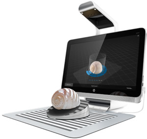 Real objects like a coffee cup can be scanned into Sprout, after which a 3D representation of them is displayed on the screen. The 3D models can be turned, reshaped, colored or cropped via hand on the Touch Mat.