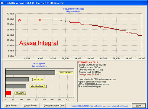 The test results from HD Tach showed that the Aka Integral was faster by 0.6MB/sec, a significant difference, especially when copying big data files. The performance with the USB host was somewhat slower too (36 vs 35 Mb/sec).