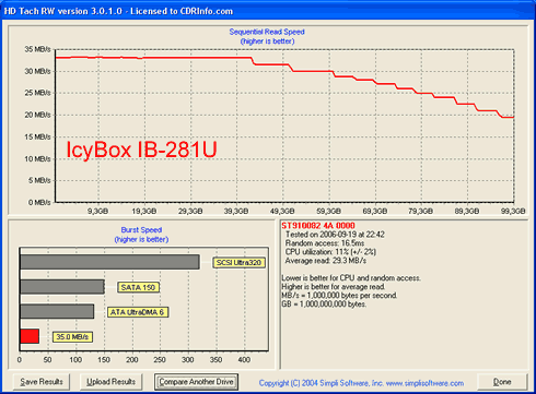 In our tests, we used a Seagate ST9100824A and HD Tach software, connected to an Asus M2N32 WS Pro motherboard. We are also going to compare the IcyBox IB-281U with the Akasa Integral.