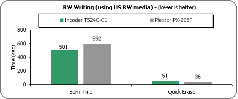 The TS24C-C1 finished in 8:21 minutes, and needed 51 seconds to perform the "quick erase" task with Nero. The Plextor drive is slower since it supports 8X maximum CD-RW speed.