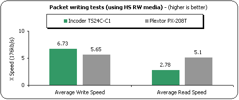 We used InCD and Ricoh HS-RW media for all Packet Writing tests. The formatting of the media takes around 10min. The formatted disc had 530mbs of free space. We copied a 403 MB file (403.147 kbs) from a Hard Disk (on the same PC as the writers) to the formatted RW media-using explorer (we dragged and dropped) we completed the test twice to eliminate possible time measurement faults and user errors: